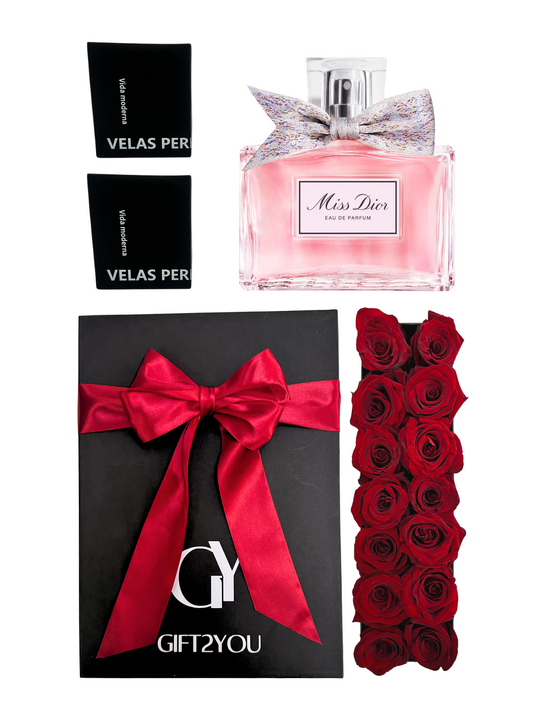 Set Perfume + Velas Aromáticas + Rosas Rojas