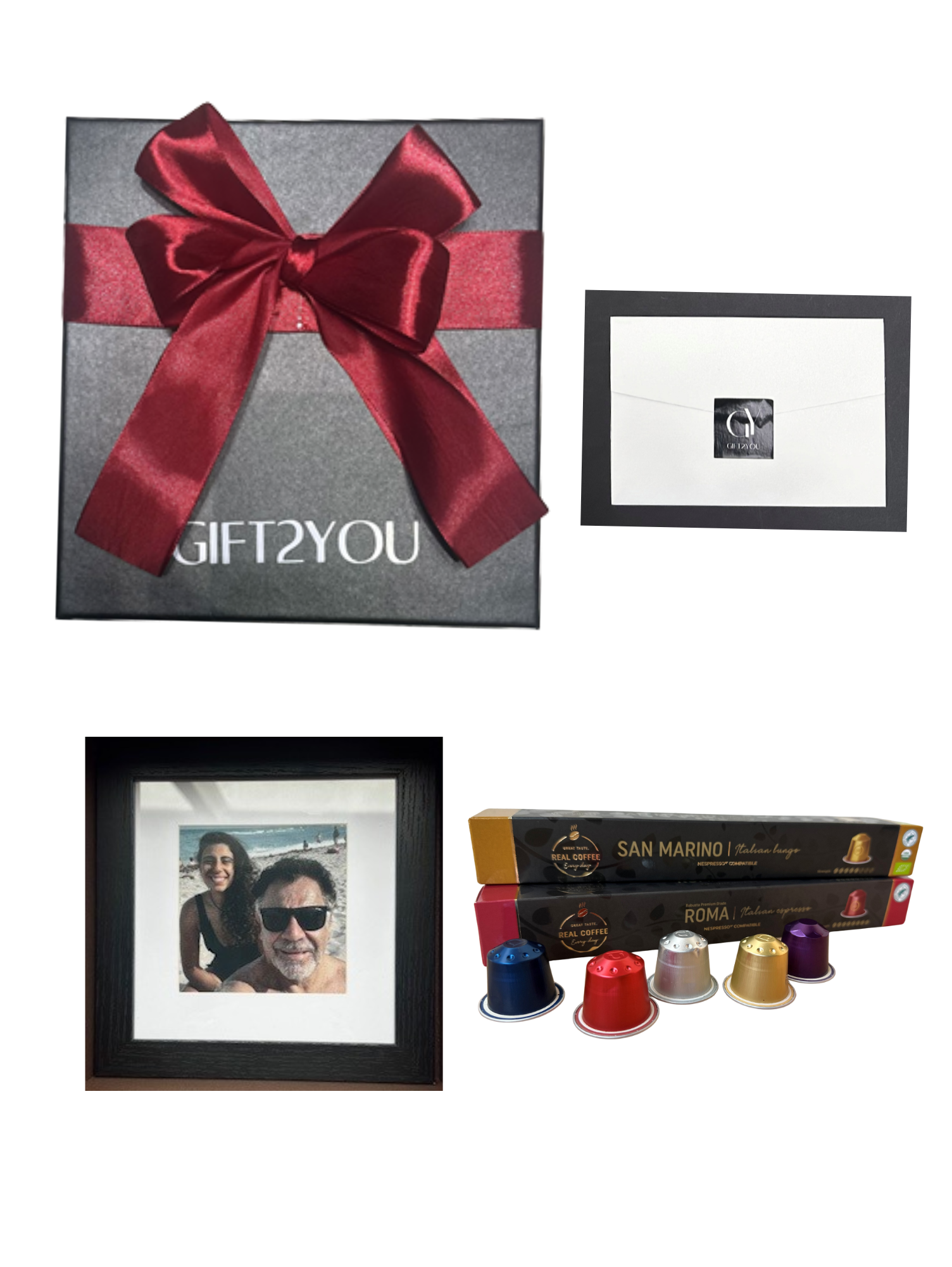 “Un regalo único y con sentido: marco de madera con tu foto especial, un sachet de café italiano Real Coffee con 10 cápsulas compatibles Nespresso y una elegante tarjeta Gift2You para acompañar tu saludo personalizado.”