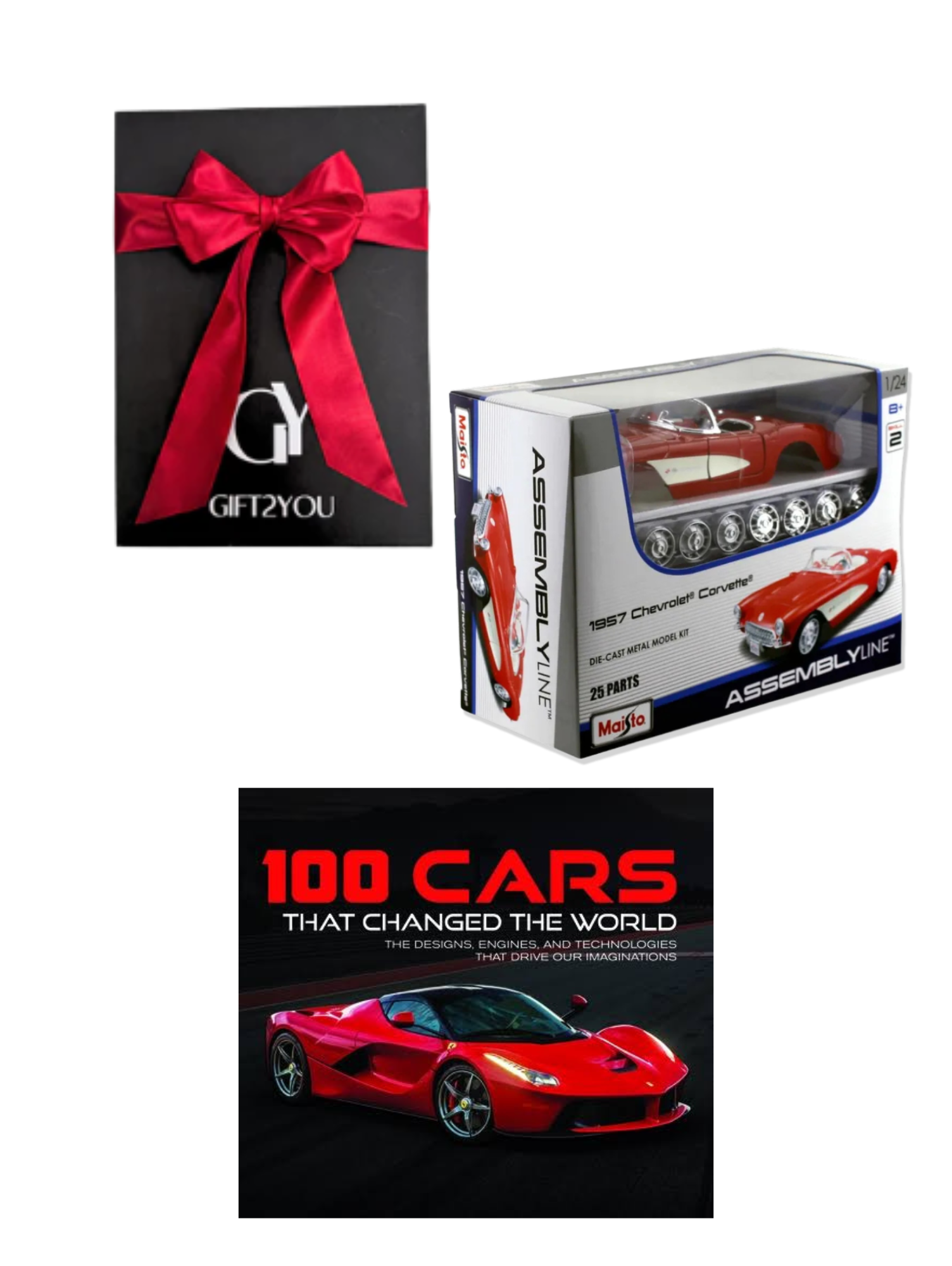 Pasión por los Autos Clásicos Un obsequio único pensado para los amantes de la historia automotriz y el diseño clásico. Este set combina la elegancia de una réplica a escala 1:24 del mítico Maisto Corvette 1957, con la inspiración y conocimiento del libro Cars Changed The World, una obra que celebra cómo los autos marcaron épocas y transformaron culturas. Presentado en una caja de regalo premium, acompañado de tarjeta de saludo personalizada, detalle que transmite sofisticación, estilo y admiración por la ingeniería y el coleccionismo. Incluye: