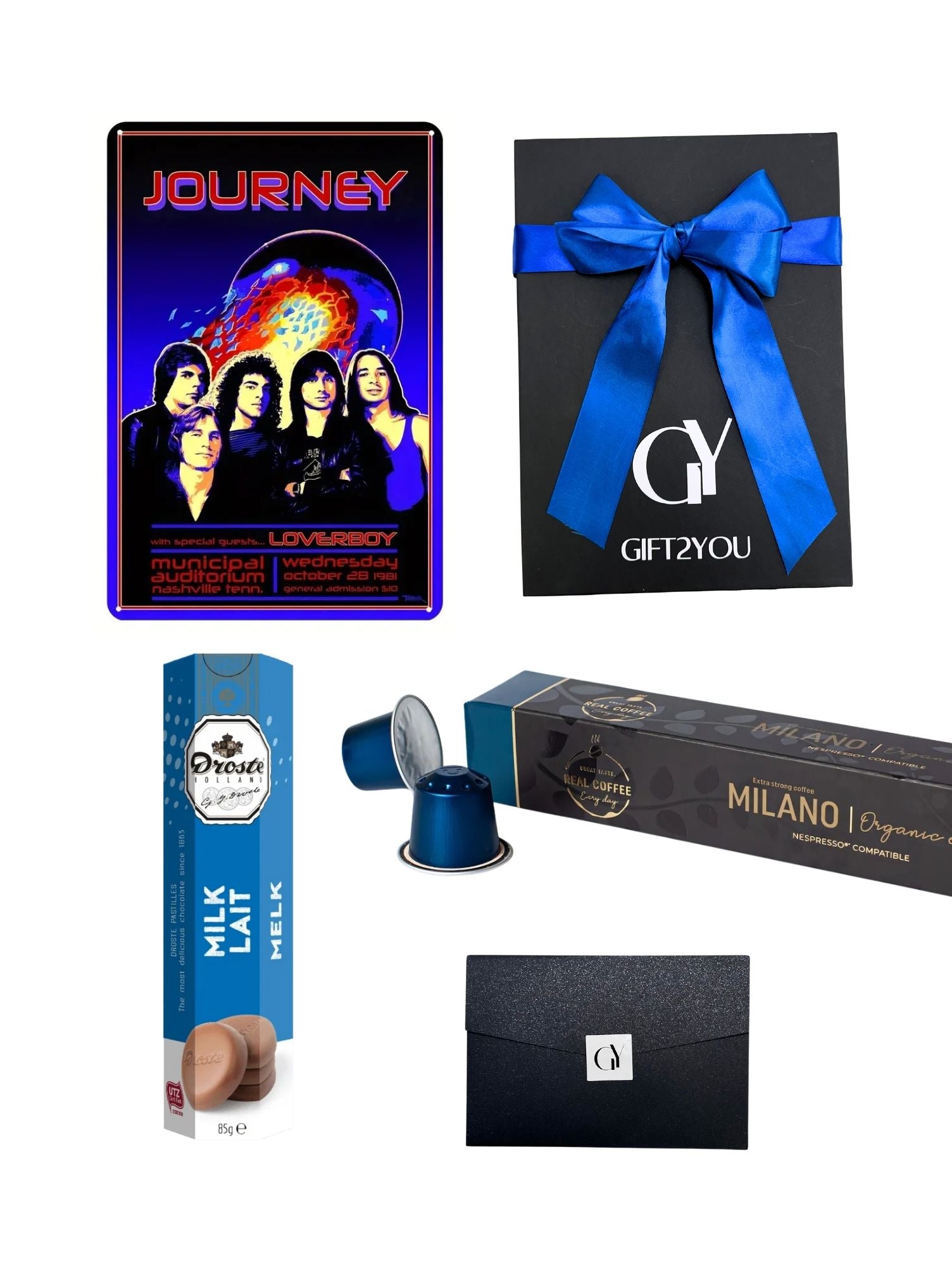 Un homenaje al rock y los buenos momentos 🎶☕️. Inspirado en Journey, este regalo mezcla café Milano con chocolates Milk Lait, ideal para quienes disfrutan la música, la energía y las pausas con sabor.