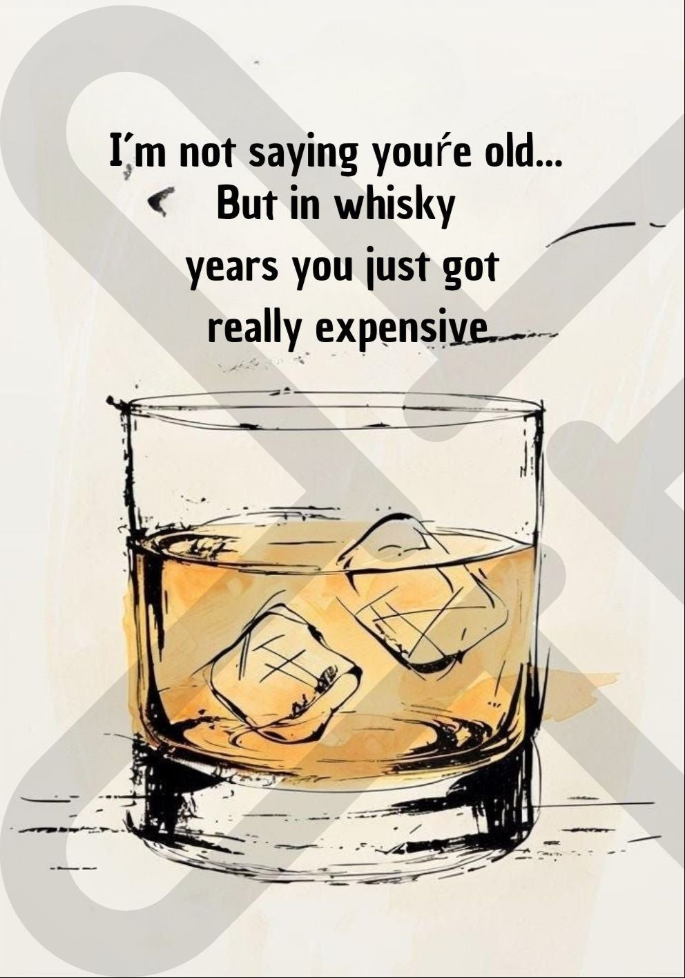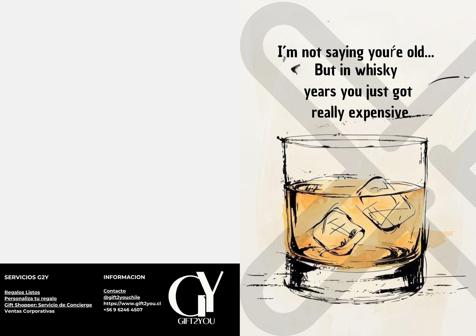 Tarjeta de saludo para cumpleaños, con un diseño clásico que compara la edad con un buen whisky: más años, más carácter. Una tarjeta divertida y elegante para quienes disfrutan de un buen trago y del humor. Ideal para acompañar tu regalo en celebraciones adultas con estilo.