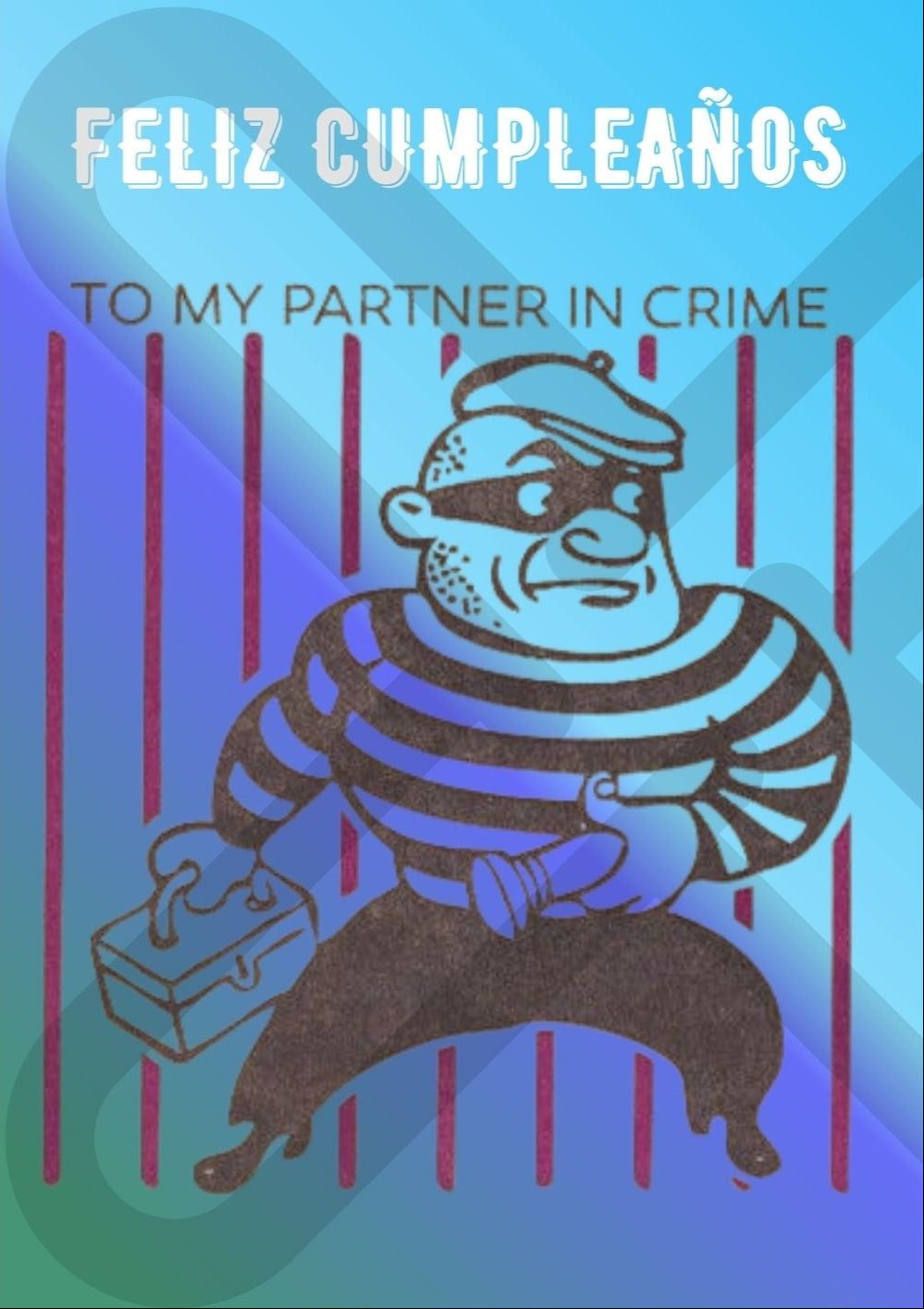 Con un estilo cómico y un diseño renovado en tonos azules, esta tarjeta es ideal para ese amigo o amiga que siempre es tu partner in crime. Perfecta para celebrar con humor y originalidad, acompañando tu regalo de cumpleaños con un detalle distinto.
