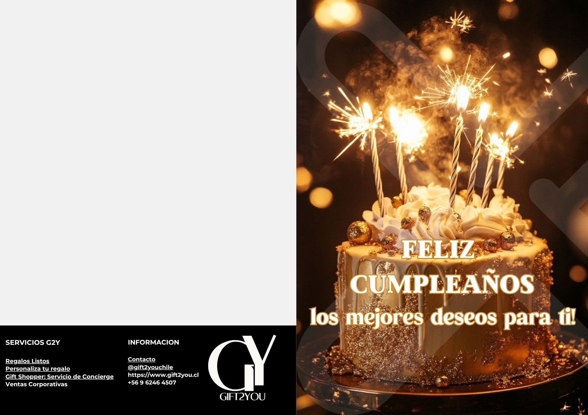 Una tarjeta llena de brillo y celebración, con un pastel dorado y bengalas que transmiten toda la magia de un cumpleaños especial. Perfecta para desear lo mejor a esa persona querida y acompañar tu regalo con un detalle sofisticado y festivo.